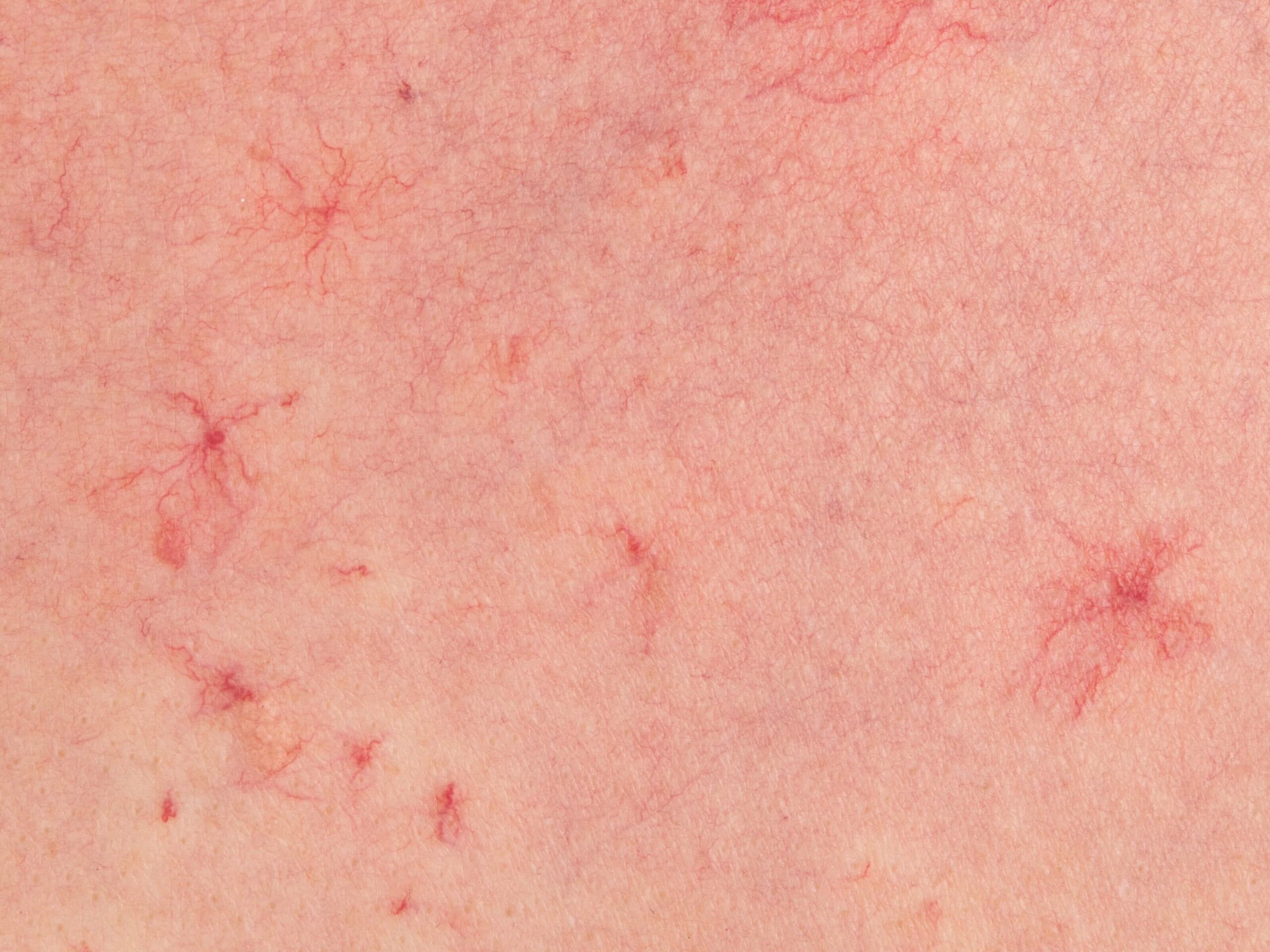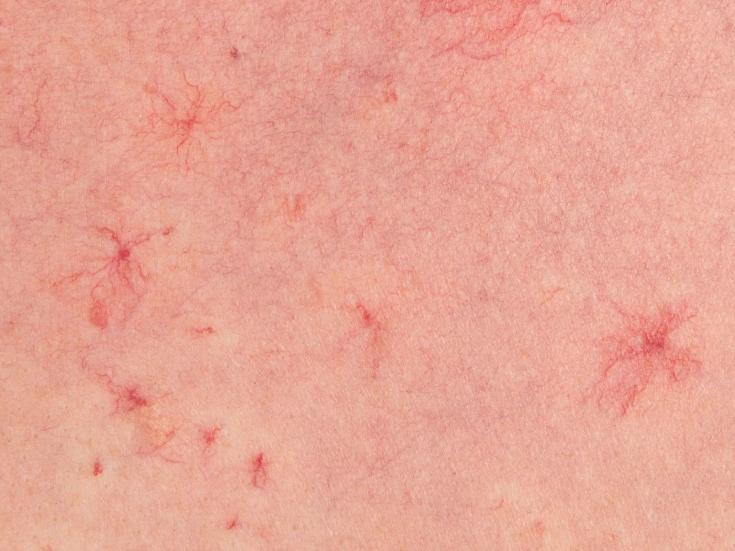 - Spider naevi – spinvormige vaatjes met een centraal rood puntje